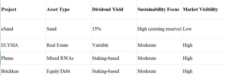 eSand operates in a competitive RWA tokenization space, alongside projects like ELYSIA, Plume, and Brickken. A comparison highlights its unique position: